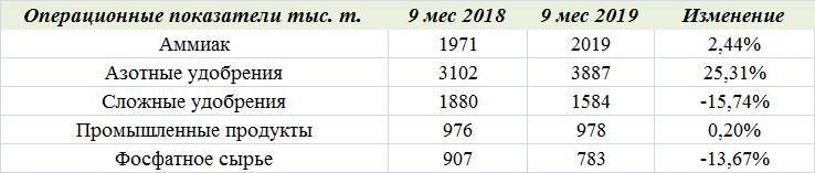 За январь-сентябрь общий выпуск товарной продукции Акрона достиг рекордных 5800 тыс. тонн, повысившись на 3,1% по сравнению с объемом за тот же период 2018-го. Производство минеральных удобрений выросло на 4,6% г/г, до 4834 тыс. тонн, благодаря увеличению объема производства аммиака на 4% г/г, до 2049 тыс. тонн, и азотных удобрений на 25% г/г, до 3887 тыс. тонн, а также сокращению выпуска сложных удобрений на 15,7% г/г, до 1584 тыс. тонн.
