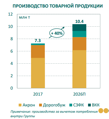 Топ-менеджмент нацелен на модернизацию производственных мощностей Акрона. В ноябре на Дорогобуже завершился проект по увеличению выпуска аммиака, в результате выпуск этой продукции планируется увеличить на 130 тыс. тонн в год. В конце прошлого года был запущен новый агрегат для производства карбамида мощностью 210 тыс. тонн в год, в текущем году в эксплуатацию введены два новых агрегата мощностью 135 тыс. тонн каждый по выпуску азотной кислоты. В результате чего у Акрона продолжает увеличиваться производство сельскохозяйственного и промышленного карбамида, а также КАС.