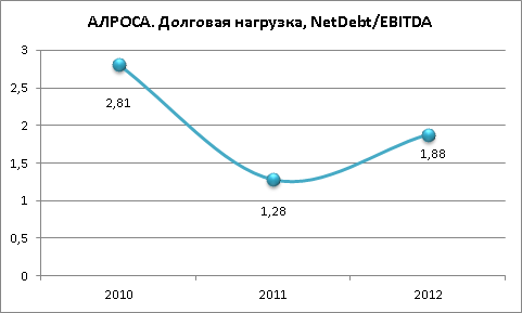 Я считаю, что АЛРОСА продолжит снижение долговой нагрузки. Стоит отметить, что три четверти долгов имеют долгосрочный характер. В частности, в текущем году компании необходимо погасить лишь 8,4 млрд руб., а основные выплаты (более 60 млрд руб.) придутся на 2015 год. На мой взгляд, более низкое значение коэффициента NetDebt/EBITDA и политика руководства, направленная на дальнейшее снижение задолженности, могли бы с большей благосклонностью быть встречены инвесторами на предстоящем в ноябре публичном размещении.