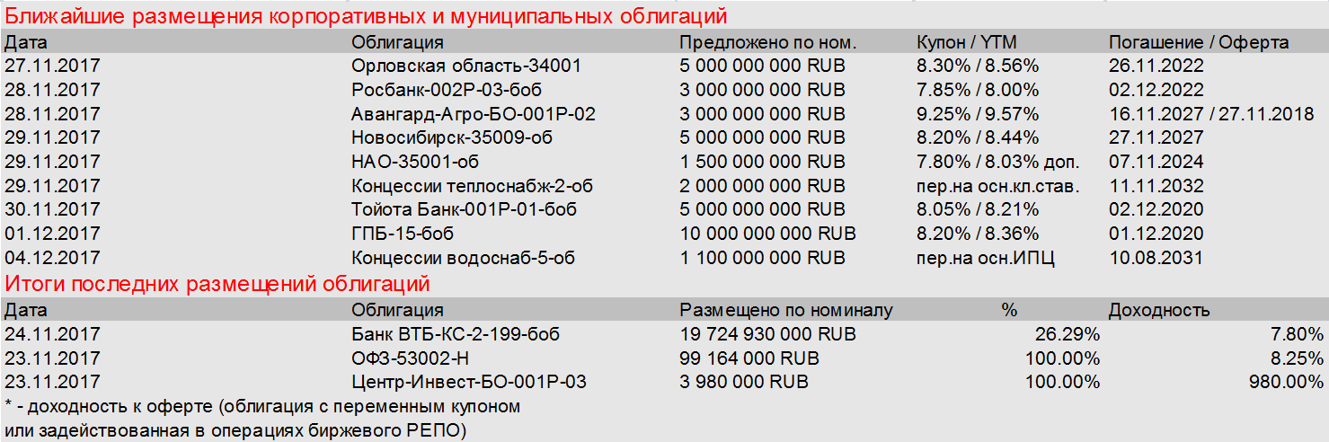 Объем денежной базы России в узком определении, по оценке ЦБ, на 17 ноября составлял 9,3996 трлн руб. против 9,3208 трлн неделей ранее. Ставки Mosprime находятся в диапазоне 8,30-8,35%. Ставка RUONIA составила 7,95%, объем сделок по ней равнялся 113,8 млрд руб. Задолженность банков по операциям репо перед ЦБ равнялась 1,59 млрд руб. Сделки проходят на основе аукционов с фиксированной ставкой. На аукционах валютного репо активности не было. Сальдо операций ЦБ с банковским сектором по представлению и абсорбированию рублевой ликвидности на 24 ноября равнялось 165,3 млрд руб.