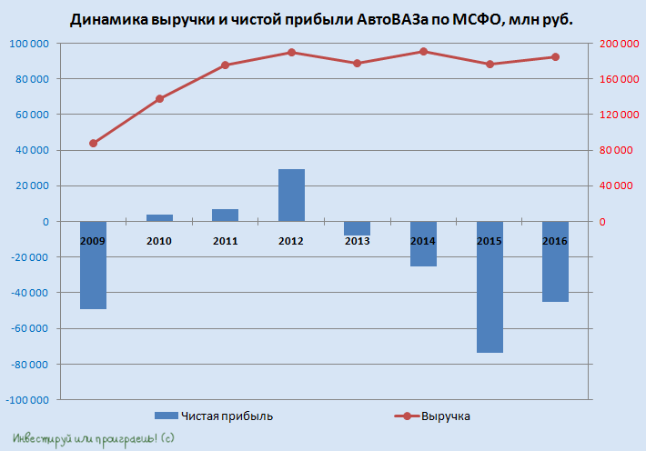Несмотря на двузначные темпы падения продаж машин и комплектующих, годовая выручка АВТОВАЗа по МСФО за прошлый год выросла на 4,8%, до 184,9 млрд руб. Это произошло исключительно благодаря повышению цен на новые модели Vesta и X-RAY. При этом 95,4% выручки, или 176,4 млрд руб. получено в России. Экспорт же сократился почти 45% из-за резкого падения реализации на основном зарубежном рынке сбыта — в Казахстане, где был введен утилизационный сбор, сильно ударивший по продажам новых легковушек.