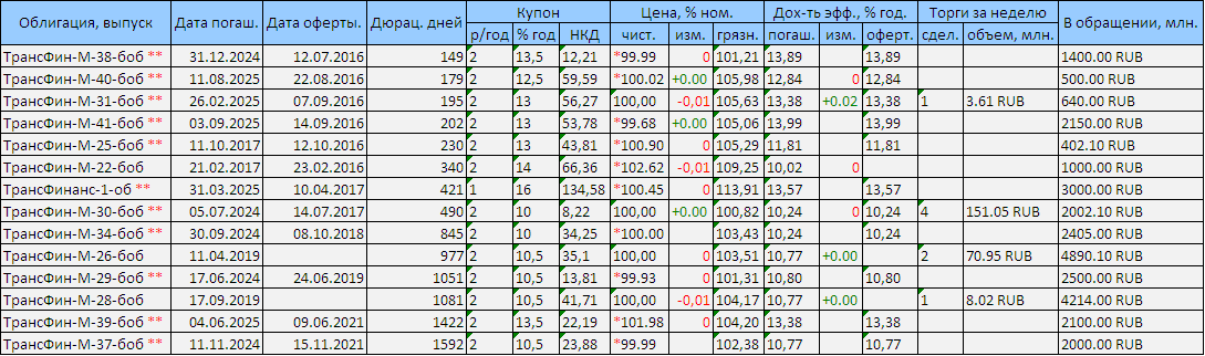В настоящее время на рынке обращается 19 выпусков облигаций ТрансФин-М суммарным номинальным объемом свыше 50 млрд руб., однако для широкого круга инвесторов представляют интерес те, что я свел в таблицу.