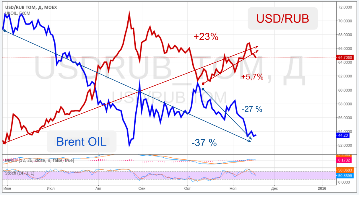 Если отталкиваться от пропорций рыночных котировок, в принципе, наблюдаем ту же картину: как в среднесрочном, так и краткосрочном периоде пара USD/RUB при сохранении обратной корреляции со стоимостью нефти демонстрирует меньшую волатильность. Особенно пропорции разнятся в краткосрочном периоде. Итак, рубль ждет обесценивание, если ему не окажут поддержку внутренние факторы.