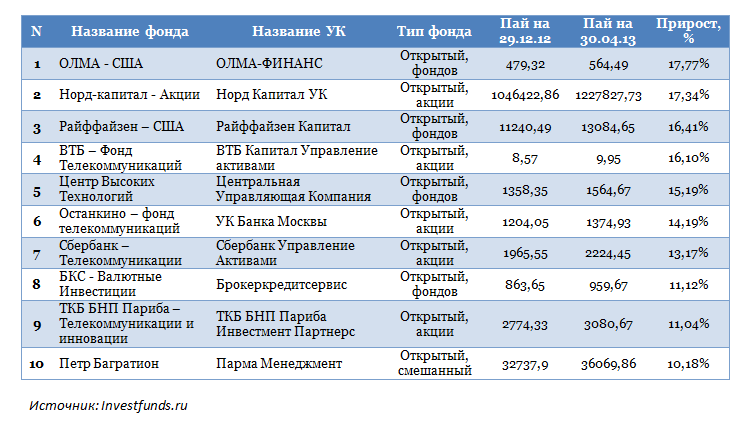 В представленном по итогам трех месяцев рейтинге со второго на первое место переместился фонд ОЛМА — США от УК ОЛМА — ФИНАНС, показавший доходность в 17,77%. На втором месте оказался Норд-капитал — Акции от УК Норд Капитал, заработавший 17,34%, благодаря урожайному апрелю. Замыкает тройку лидеров Райффайзен — США от УК Райффайзен Капитал, показавший прирост по паю с начала года в 16,4%. Остальные участники десятки представлены в основном ПИФами, состоящими из акций телекомов и их можно посмотреть в таблице ниже.
