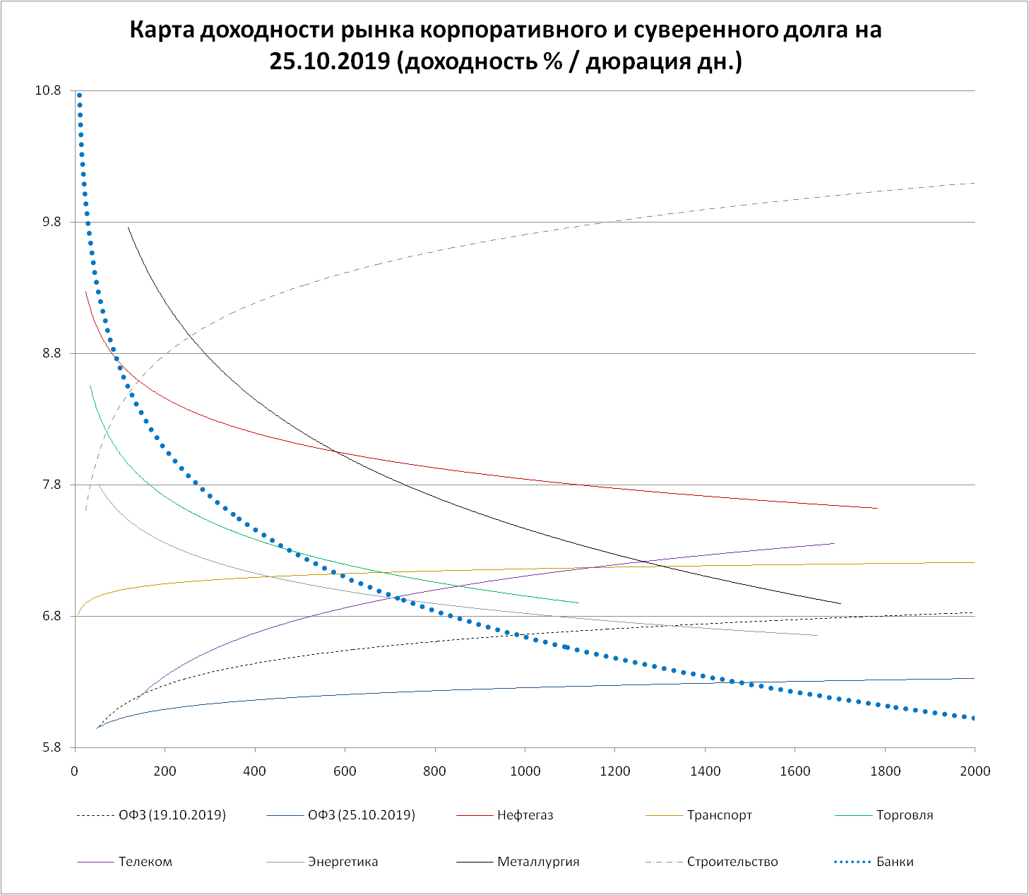 Доходности облигаций нефтегазового, торгового, телекоммуникационного и транспортного сегментов рынка корпоративного долга оставались без изменений. В энергетическом сегменте YTM облигаций снизились в среднем на 0,36 п.п., в металлургическом — на 0,34 п.п., в строительном — на 0,24 п.п., в банковском — на 0,12 п.п.