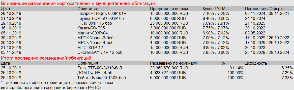 Объем денежной базы в узком определении увеличился с 11 по 18 октября на 45,5 млрд руб., до 10 трлн 685,9 млрд руб. Ставки Mosprime к концу прошлой недели находились в диапазоне 7,03-7,04%. Средневзвешенная за неделю ставка RUONIA составила 6,69%, общий объем сделок по ней равнялся 488,3 млрд руб. Сальдо операций ЦБ с банковским сектором по представлению и абсорбированию рублевой ликвидности на 25 октября составляло 181,6 млрд руб.