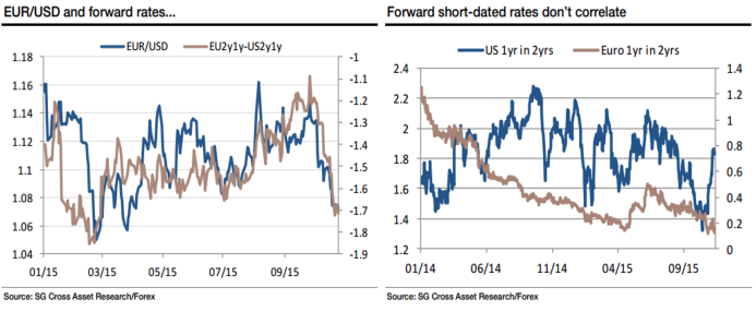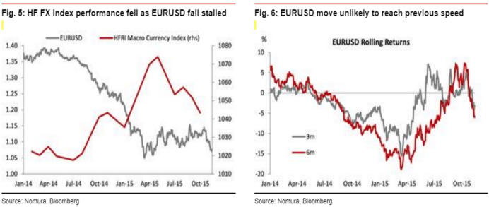 Падение EUR/USD в ответ на трагические события в Париже привело к возобновлению дискуссий относительно статуса евро. Обвал фондовых индексов сопровождался укреплением надежных активов, в то время как региональная валюта продолжала сдавать позиции. В чем дело? Неужели она так же быстро лишилась своих функций, как и приобрела их? Nomura полагает, что да. Отток капитала из еврозоны и разные направления денежно-кредитной политики ЕЦБ и ФРС перекрывают фактор склонности инвесторов к риску, а недавняя реакция евро на усиление геополитической напряженности свидетельствует о том, что эта валюта осталась без важного козыря. Это дает основания предполагать, что обвал EUR/USD в ближайшие месяцы ускорится, и уже в 1-м квартале 2016 пара достигнет паритета.