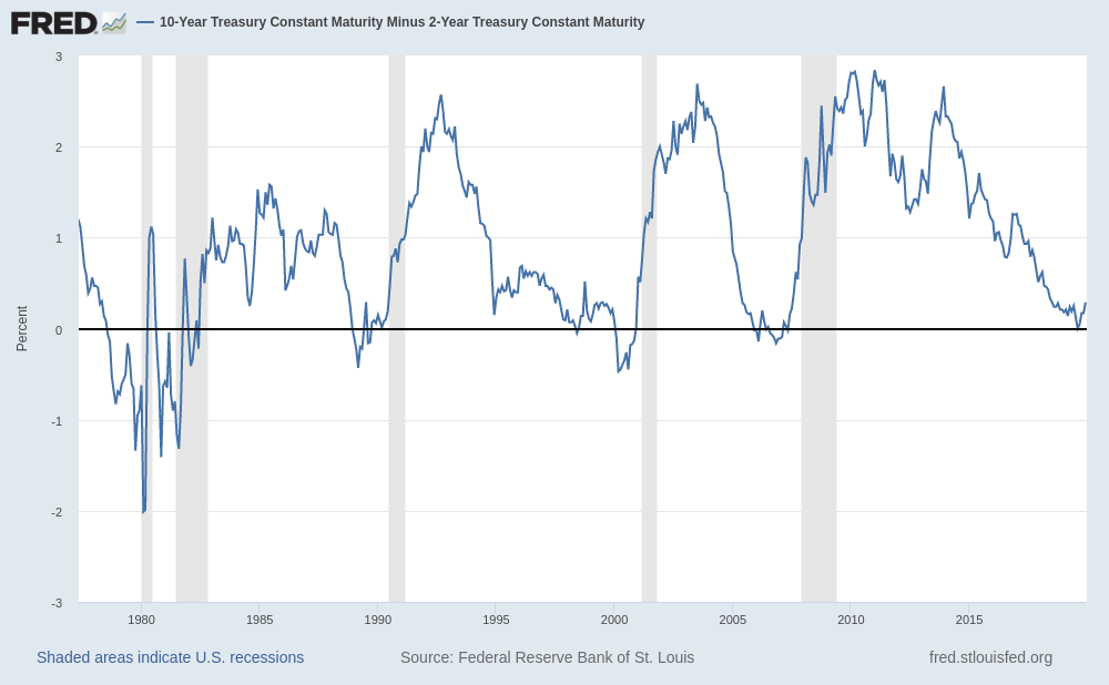 В то же время кривая спреда ставок явно указывает на приближение рецессии.