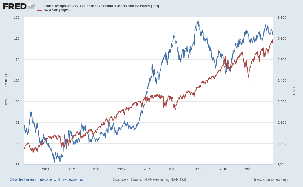 Частично, это связано с повышенным интересом к рынку акций США, инвестировать в который можно только в долларах. Соответственно, приток капитала поддерживал курс американской валюты на протяжении последних десяти лет. Однако не факт, что фондовый рынок США останется в позитивном тренде в течение всего 2020 года, тогда как ФРС с вероятностью 52% не будет менять учетную ставку в ближайшие 12 месяцев.