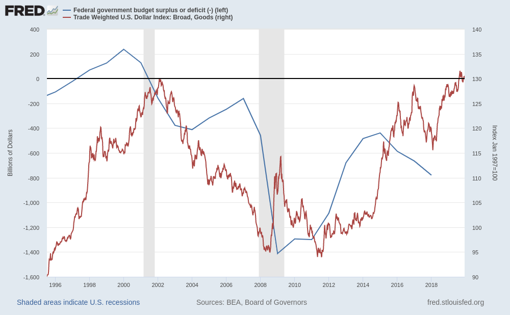 Анализ ситуации за последние 20 лет выявляет прямую зависимость между состоянием дефицита бюджета США и курсом доллара. Иными словами, когда дефицит бюджета растет, доллар дешевеет, и наоборот.