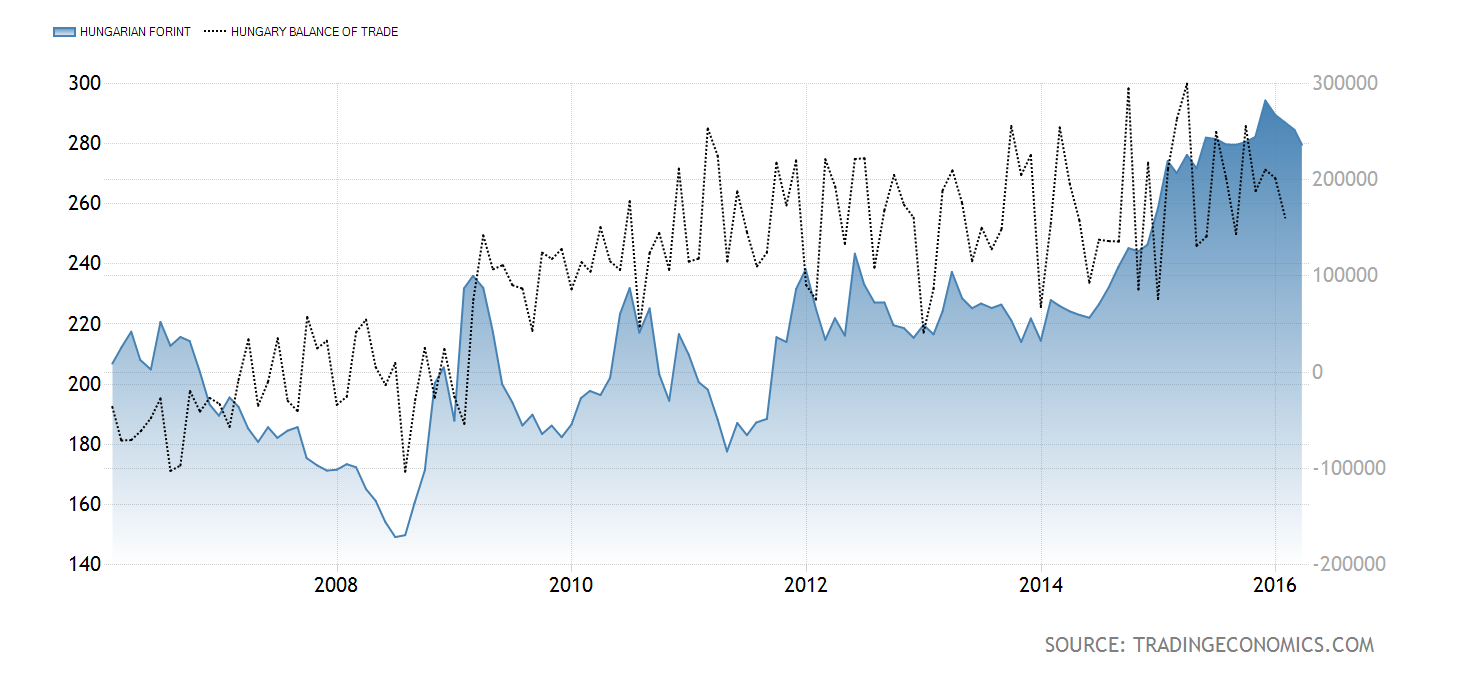 Венгрия, безусловно, может себе позволить смягчение денежно-кредитной политики, поскольку в феврале роста потребительских цен в стране замедлился с 0,9% до 0,3%. Инфляция держится ниже таргета в 3% на протяжении последних 39 месяцев, а укрепление форинта делает перспективы ее роста туманными. Прогноз центробанка по CPI на текущий год был снижен с 1,7% до 0,3% из-за ухудшения перспектив мировой экономики, низких цен на нефть и падения инфляционных ожиданий до исторических минимумов. По мнению Capital Economics, ЦБ Венгрии продолжит цикл монетарной экспансии, снизив ставку до 1% к концу года. HSBC ожидает подобных действий регулятора уже летом, а Erste Group Bank прогнозирует падение показателя до 0,75% к концу декабря, что приведет к росту EUR/HUF до 318.