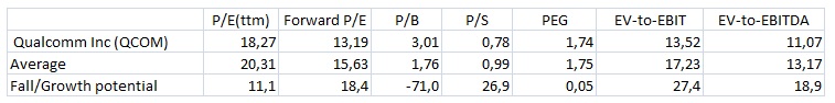 Qualcomm недооценена почти по всем мультипликаторам. По P/E с учетом прошлой 12-месячной прибыли на акцию (ttm) и прогнозируемой (forward) есть потенциал роста в размере 11,1% и 18,4% соответственно. По P/S и цена/рост доходов (PEG) Qualcomm оценена по 0,78 и 1,74 при средних по отрасли показателях 0,99 и 1,75. По EV/EBITDA и EV/EBIT потенциал роста капитализации компании до среднеотраслевых уровней составляет 27,4% и 18,9%.