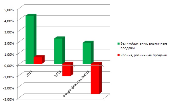 В последних числах марта Япония выпустила данные о динамике розничной торговли за февраль, зафиксировавшие ухудшение показателя на 2,3% м/м. Причем эта негативная тенденция наблюдается последние четыре месяца, а в январе-феврале оборот розничной торговли в Японии сократился на 2,69%. При этом Великобритания за тот же период нарастила розничную торговлю на 1,89%. И опережает Японию по этому показателю с 2014-2015 годов. Почему я уделяю повышенное внимание этому индикатору? Потому что розничные продажи выступают как качественный опережающий индикатор ВВП.