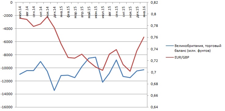 Между тем британская экономика может получить дополнительный позитивный импульс для от изменения курса фунта. В последние четыре месяца он демонстрирует снижение к валюте своего главного торгового партнера — евро. За этот период кросс-курс ERU/GBP укрепился на 12,9%, что будет оказывать положительное влияние на торговый баланс Соединенного Королевства. Поскольку эффект от изменения курса валюты сказывается на показателях экспорта и импорта с временным лагом, то поддержку они получат как раз во 2-м квартале.