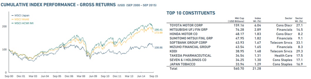 Валовая доходность фонда за десять лет составила 1,31%. MSCI Japan отыгрывает хуже MSCI World. Количество компаний в индексе — 316, большинство из них представляют потребительский, финансовый и производственный сектор.