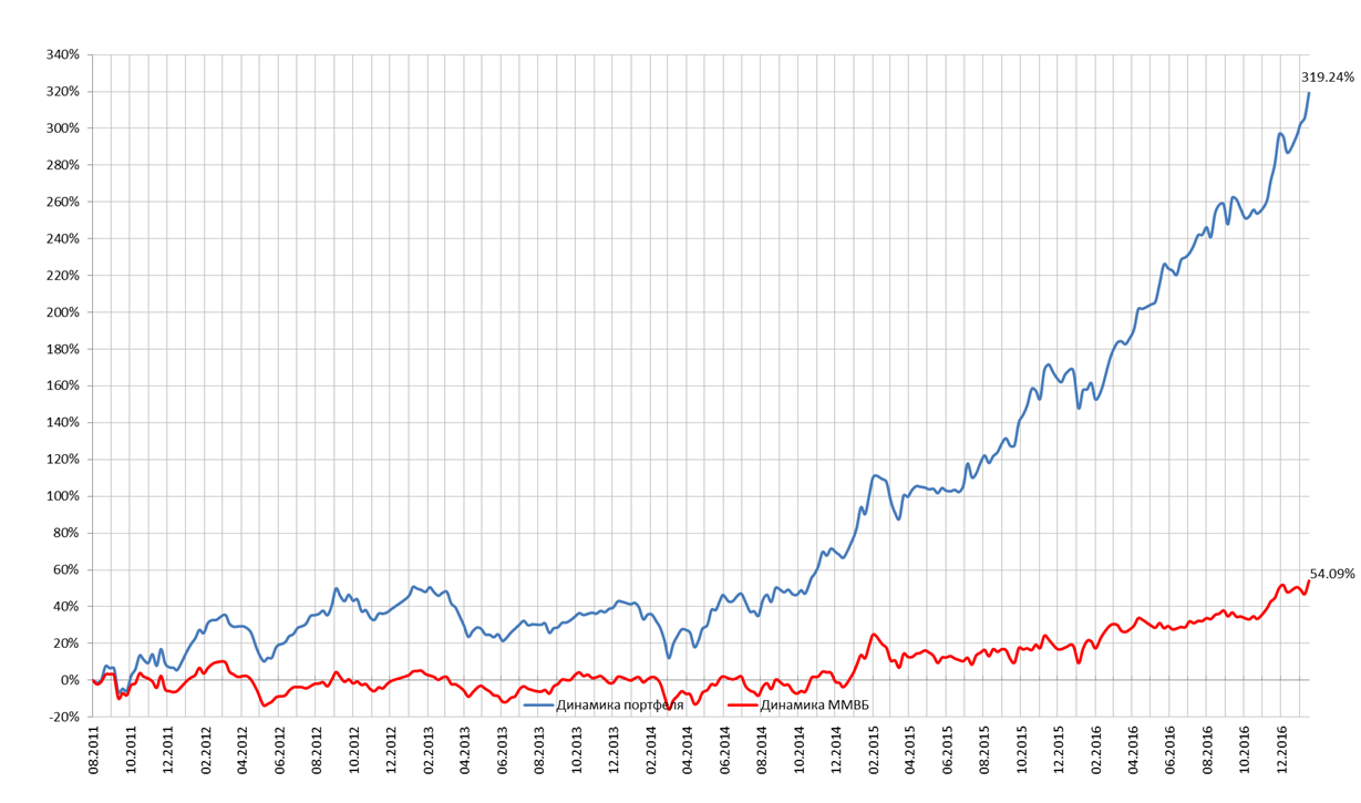 Доходность модельного портфеля с момента начала отсчета по сравнению с бенчмарком в виде индекса ММВБ