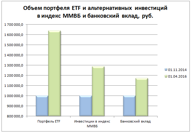В состав портфеля входит от четырех до шести из 12 торгующихся на Московской бирже фондов. Базой для формирования портфеля стал 1 млн руб. Стратегия управления его активами основана на принципах диверсификации вложений и активной перебалансировки по результатам мониторинга и оценки основных новостей, касающихся рынков и активов, в которые инвестированы средства ETF. Результаты управления портфелем сравниваются с динамикой индекса ММВБ и доходностью банковского вклада. Сравнение с индексом ММВБ демонстрирует разницу между инвестициями в Россию и в зарубежные рынки. Ставка условного депозита определяется ставкой топа-10 банков, привлекающих наибольший объем вкладов.