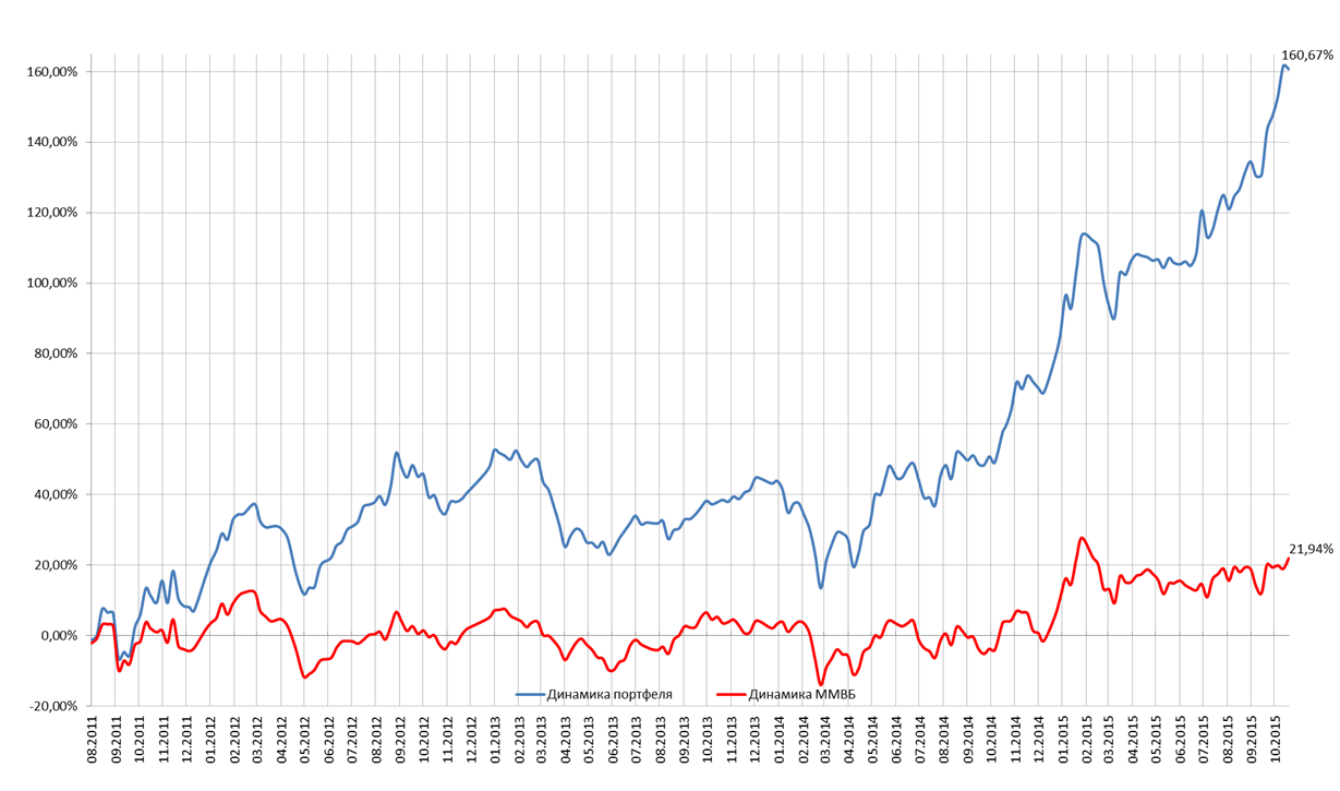 Доходность модельного портфеля с момента начала отсчета по сравнению с бенчмарком в виде индекса ММВБ