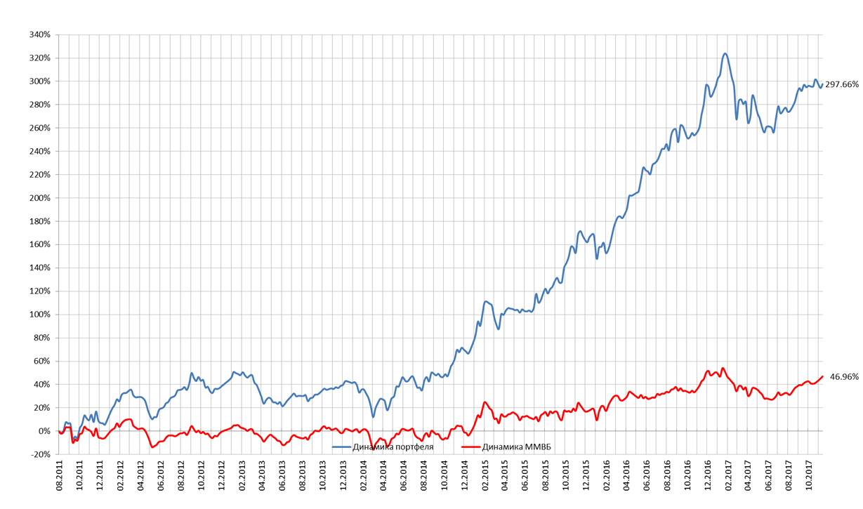 С 17 ноября совокупные активы нашего модельного портфеля подорожали на 0,81%. Как было сказано выше, индекс ММВБ вырос на 1,37%. Спред (разрыв в доходности) между ними с начала отчета расширился и составил 250,70% п.п. в нашу пользу.