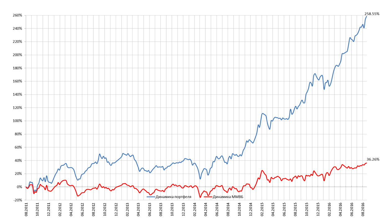 Доходность модельного портфеля с момента начала отсчета по сравнению с бенчмарком в виде индекса ММВБ