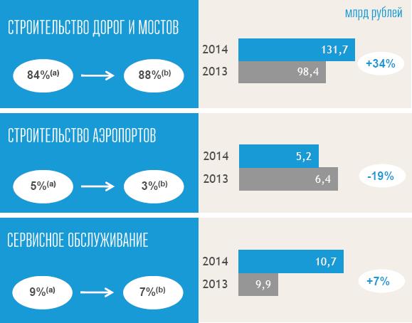 Выручка Мостотреста по итогам 2014 года выросла на внушительные 29%, до 150,5 млрд руб., и прежде всего за счет бурного развития в сегменте строительства мостов и дорог (+34% г/г), на который приходится порядка 88% всего оборота компании. Вышеупомянутый участок скоростной автодороги М-11 Москва—Санкт-Петербург,  а также Бусиновская транспортная развязка и обход Новой Усмани автодороги М-4 Дон внесли немалый вклад развитие этого сегмента. Строительство аэропортов принесло Мостотресту на 19% меньше выручки по сравнению с 2013 годом из-за уменьшения объемов работ  по реконструкции аэропорта в Петропавловск-Камчатском и завершения реконструкции столичного аэропорта Внуково. Зато оказание услуг на участках автомобильных дорог М-1,М-4 и М-5 продолжает радовать: за отчетный период сервисные услуги выросли на 7% в денежном выражении, а уже в этом году к этой группе присоединится еще и участок дороги М-11.