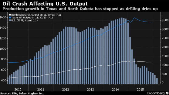Динамика числа буровых установок и объемов добычи в отдельных регионах США