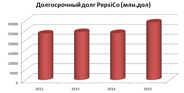 На рентабельности чистой прибыли PepsiCo следует остановиться более подробно. По этому показателю компания уступает практически всем своим конкурентам. Причем из года в год по размеру выручки PepsiCo их значительно опережает. Если сравнивать двух гигантов рынка, то за последние четыре года средняя рентабельность чистой прибыли у Coca-Cola составила 17,28%, а у PepsiCo — 9,5%. Нельзя обойти стороной и динамику долговой нагрузки компании. Ее долгосрочный долг по итогам 2015 года увеличился на 22,63%, до $29,21 млрд. Таким образом, мы видим, что прибыль компании сокращается, а долг увеличивается. Что может быть хуже для инвестора?