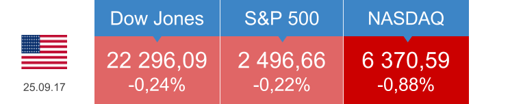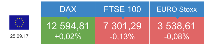 По данным института IFO, в сентябре индекс делового оптимизма в Германии составил 115,2 п. (прогноз: 116,0 п. после 115,9% месяцем ранее). Биржи Европы завершили торги 25 сентября в небольшом минусе.