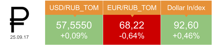 Brent в рублях 25 сентября подорожала на 4,27%, до 3 404 руб. Ставка по однодневным кредитам Mosprime выросла сразу на 3 б.п., до 8,40%. Цена бареля Brent подбирается вплотную к отметке $60, а этот уровень означает равновесную цену пары USD/RUB равную 57 руб. Я считаю, что в ходе торгов 26 сентября к этому уровню пара и будет двигаться.