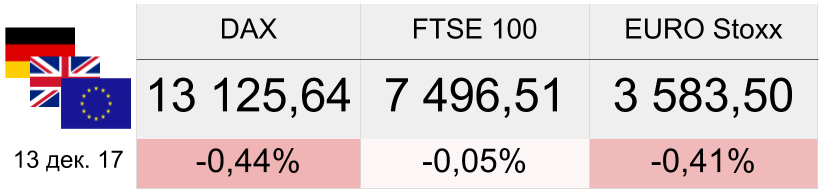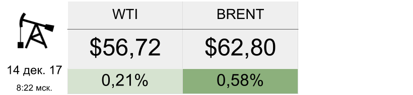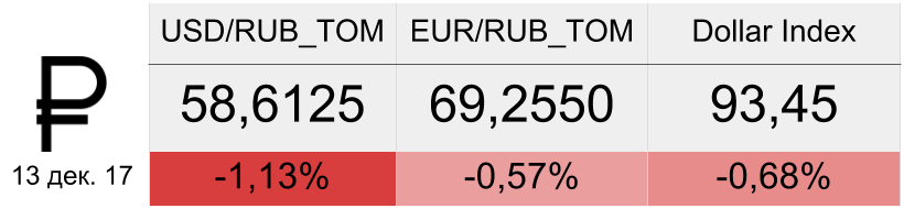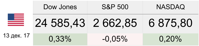 В ноябре индекс потребительских цен (CPI) в США вырос на 0,4% м/м и 2,2% г/г, как и прогнозировалось. По итогам заседания ФРС процентная ставка установлена на уровне 1,25-1,50%, что также совпало с рыночным консенсусом. В 2018-2019 году регулятор прогнозирует еще по три раунда ужесточения монетарной политики. Долгосрочный таргет ФРС по ставке — 2,8%. В комментариях тон регулятора был в целом «ястребиным», при этом доходность UST10 рухнула, а золото подорожало. Фондовые площадки США бурной реакции на решение и риторику Федрезерва не продемонстрировали.