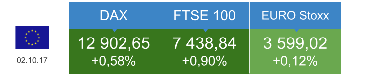 Согласно исследованиям Markit, в сентябре индекс деловой активности в промышленности Германии составил 60,6 п., как и прогнозировалось. В августе безработица в еврозоне осталась на июльском уровне 9,1%, хотя ожидалось ее символическое снижение на 0,1%. Индекс производственного сектора (Markit PMI) еврозоны за сентябрь составил 58,1 п. при прогнозе 58,2 п., без изменений. Торги 2 октября фондовые площадки Европы провели в плюсе преимущественно благодаря позитивной динамике в США и слабеющему евро.