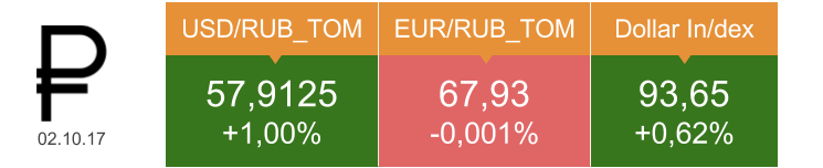 Brent в рублях 2 октября подешевела на 0,37%, до 3 247 руб. Ставка по однодневным кредитам Mosprime снизилась на 5 б.п., до 8,65%. Укрепление доллара на фоне слабеющего из-за референдума в Каталонии евро и снижение нефтяных котировок ожидаемо привели к росту пары USD/RUB. При этом краткосрочные ставки МКБ все еще выше учетной, поэтому обвала рубля ждать не следует. На мой взгляд, торги 3 октября пара USD/RUB проведет в диапазоне 57,5-58,5 руб.