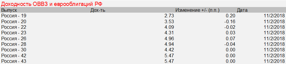 Объем денежной базы РФ в узком определении на 26 октября снизился с 10,411 трлн руб. на 19 октября до 10,296 трлн руб. Ставки Mosprime к концу недели находились в диапазоне 7,46-8,43%. Средневзвешенная за неделю ставка RUONIA составляла 7,14%, общий объем сделок по ней равнялся 794,4 млрд руб. Задолженность банков по операциям репо перед ЦБ составила 1,70 млрд руб. Сделки прошли на основе аукционов с фиксированной ставкой. На аукционах валютного репо активности не было. Сальдо операций ЦБ с банковским сектором по представлению и абсорбированию рублевой ликвидности на 2 ноября составило 201,9 млрд руб.