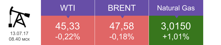 Цена на WTI 12 июля снизилась на 0,68%, до $45,43, Brent подешевела на 1,03%, до $47,67. Нефтяная статистика по США оказалась неоднозначной. С одной стороны, запасы нефти за неделю снизились на 7,564 млн баррелей при прогнозе 2,85 млн, а запасы бензина упали на 1,647 млн баррелей, хотя ожидалось их увеличение на 1,147 млн. С другой стороны, по данным EIA, за прошедшую неделю нефтедобыча в США выросла до 9,397 млн баррелей в сутки (+0,63%), и это перевесило позитив. К тому же ОПЕК в ежемесячном отчете указала на снижение спроса на нефть в 2018 году. Рынку нужно время на осмысление этой информации, поэтому, вероятно, 13 июля мы увидим нейтральную динамику нефтяных котировок.