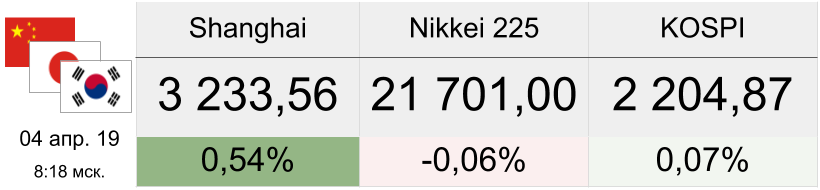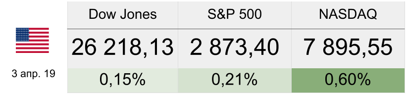 Индекс экономических условий в непроизводственной сфере США в марте составил 56,1 п. (прогноз: 58 п. после 59,7 п. месяцем ранее). Вчера торги на американских биржах завершились ростом: инвесторы ждут скорого объявления о заключении торгового соглашения между США и Китаем.