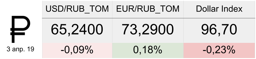 Brent в рублях 3 апреля подорожала на 2,18%, до 4 533,61. Ставка по однодневным кредитам Mosprime выросла на 1 б.п. и составила 7,89%. Суммарный объем привлеченных средств на вчерашнем аукционе Минфина по размещению ОФЗ составил чуть более 83 млрд руб., что выше уровня предыдущего аукциона и в целом заслуживает положительную оценку. Довольно неожиданно (нефть в марте по факту выросла на бирже) Минфин в апреле снизил плановый объем покупки валюты с мартовских 310 млрд руб. до 255,4 млрд руб. Если учесть еще и отложенные покупки ЦБ, получается, что ежедневный объем интервенций составит порядка $220 млн, что не должно оказать существенного влияния на валютную ликвидность финансовой системы. В целом пока у пары USD/RUB не причин существенно отклонятся от уровня 65 руб.