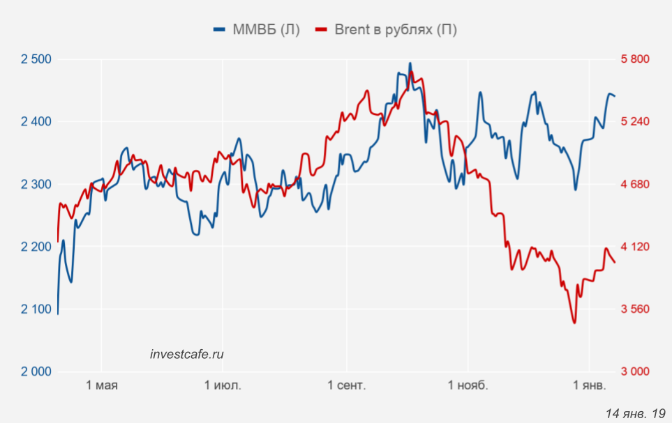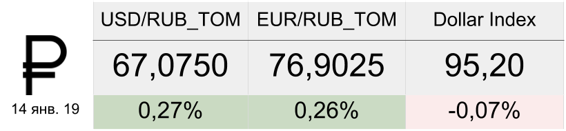 Brent в рублях 14 января подешевела на 1,90%, до 3 973,52. Ставка по однодневным кредитам Mosprime снизилась на 5 б.п. и составила 7,83%. Вчера динамика рубля в целом следовала за EM-валютами на Forex, которые двигались вниз на фоне слабой декабрьской статистики по торговле в Китае. Сегодня ЦБ возобновляет валютные интервенции, но также начинается очередной налоговый период. Кроме того, Минфин проводит аукцион по размещению ОФЗ, так что повышенное предложение рубля будет компенсировано. На мой взгляд, пара USD/RUB далеко от отметки 67 руб. не отойдет.