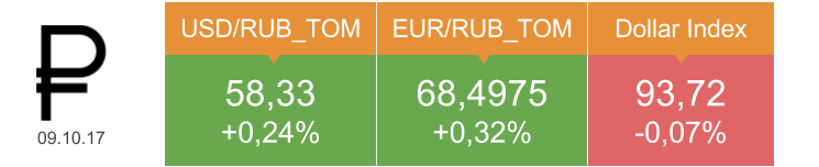 Вчера Brent в рублях подорожала на 0,33%, до 3 246 руб. Ставка по однодневным кредитам Mosprime выросла на 12 б.п., до 8,56%. Рубль ослабевал по отношению к основным мировым валютам даже в условиях небольшого роста цен на нефть и снижения доллара, что говорит о внутренней неустойчивости отечественной валюты. Вероятно, причиной этого стало повышение доходности американских бондов, из-за чего привлекательность рубля, как высокодоходной валюты, снижается. На мой взгляд, 10 октября пара USD/RUB останется в коридоре 58-58,5 руб.
