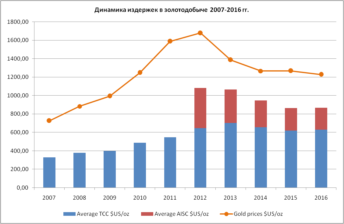В то же время текущие ценовые минимумы на спот-рынке уже близки к прогнозируемой по итогам 2016-го средней AISC по отрасли. Данные девяти крупнейших золотодобывающих компаний (Barrick Gold, Newmont Mining, Polyus Gold и др.) показывают, что средневзвешенные издержки будут консолидироваться около $860-870 за унцию по мере публикации отчетов за 4-й квартал. Из графика ниже заметно, что это практически равно прошлогодним значениям, так что меры оптимизации издержек, вероятно, исчерпаны.