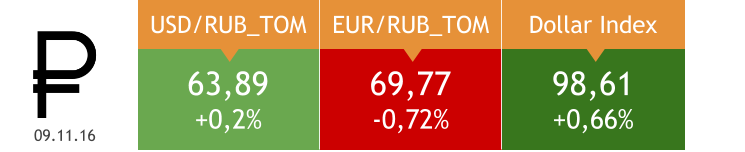 Индекс доллара накануне поднялся на 0,66%, евро снизился на 0,91%. Рубль незначительно подешевел по отношению к доллару и укрепился к евро. Ставка по однодневным кредитам MosPrime выросла на 44 б.п. до 10,11%, что указывает на возвращение ликвидности рубля на внутреннем рынке в нормальное состояние. Валютные рынки пока еще не отошли от "Трампошока" но нефть кажется нащупала дно. Я считаю 10 ноября рубль избежит сильной волатильности и останется приблизительно в пределах вчерашнего дня с тенденцией к укреплению.