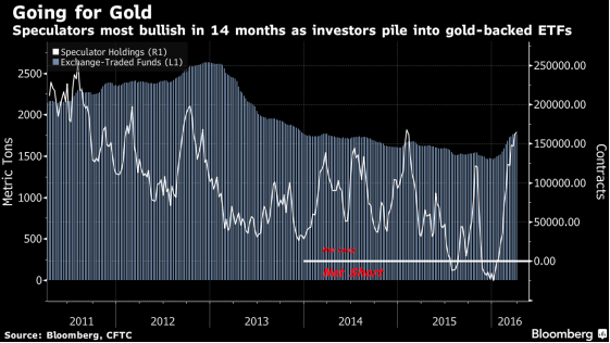 В первую очередь речь идет о некотором спаде спроса на физический актив. Стремительный рост котировок драгметалла в 1-м квартале, лучшем с 1986 года, несколько поумерил аппетиты потребителей. Индийский импорт золота по итогам первого месяца весны сократился с 35 тонн до 16. За год, завершившийся в марте, в страну было ввезено 894 тонны золота, что существенно ниже показателя 2014/2015 (1133 тонны). Резкий обвал цен в преддверии публикации non-farm payrolls аукнулся сокращением запасов ETF до 1762,1 тонны, хотя индикатор остается вблизи многомесячных максимумов. Там же, впрочем, держатся и нетто-лонги хедж-фондов, которые на текущих отметках в последний раз видели в январе 2015-го.